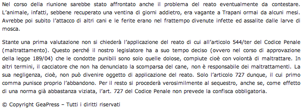 Trapani – cane mangiato dai vermi sarà consegnato al proprietario. Diffida del Partito Animalista Europeo