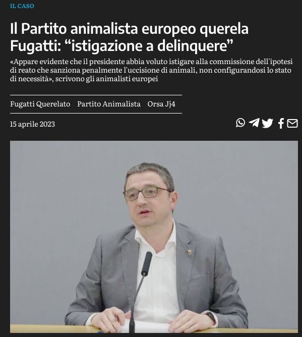 DENUNCE-QUERELE / DIFFIDE avverso POLITICI e PARLAMENTARI, ORSI TRENTINO no comments »ORSI, FUGATTI QUERELATO DAL PAE PER I REATI DI ISTIGAZIONE A DELINQUERE E DELITTO TENTATO: “RISCHIA 5 ANNI DI CARCERE”